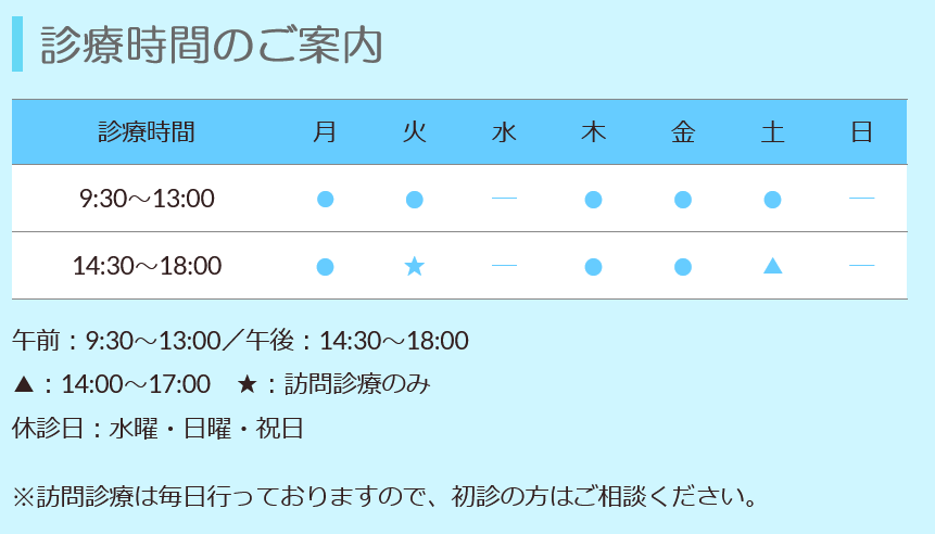 | 営業時間 | 午前:9:30~13:00/午後:14:30~18:00 ▲:14:00~17:00 ★:訪問診療のみ 休診日:水曜・日曜・祝日 |